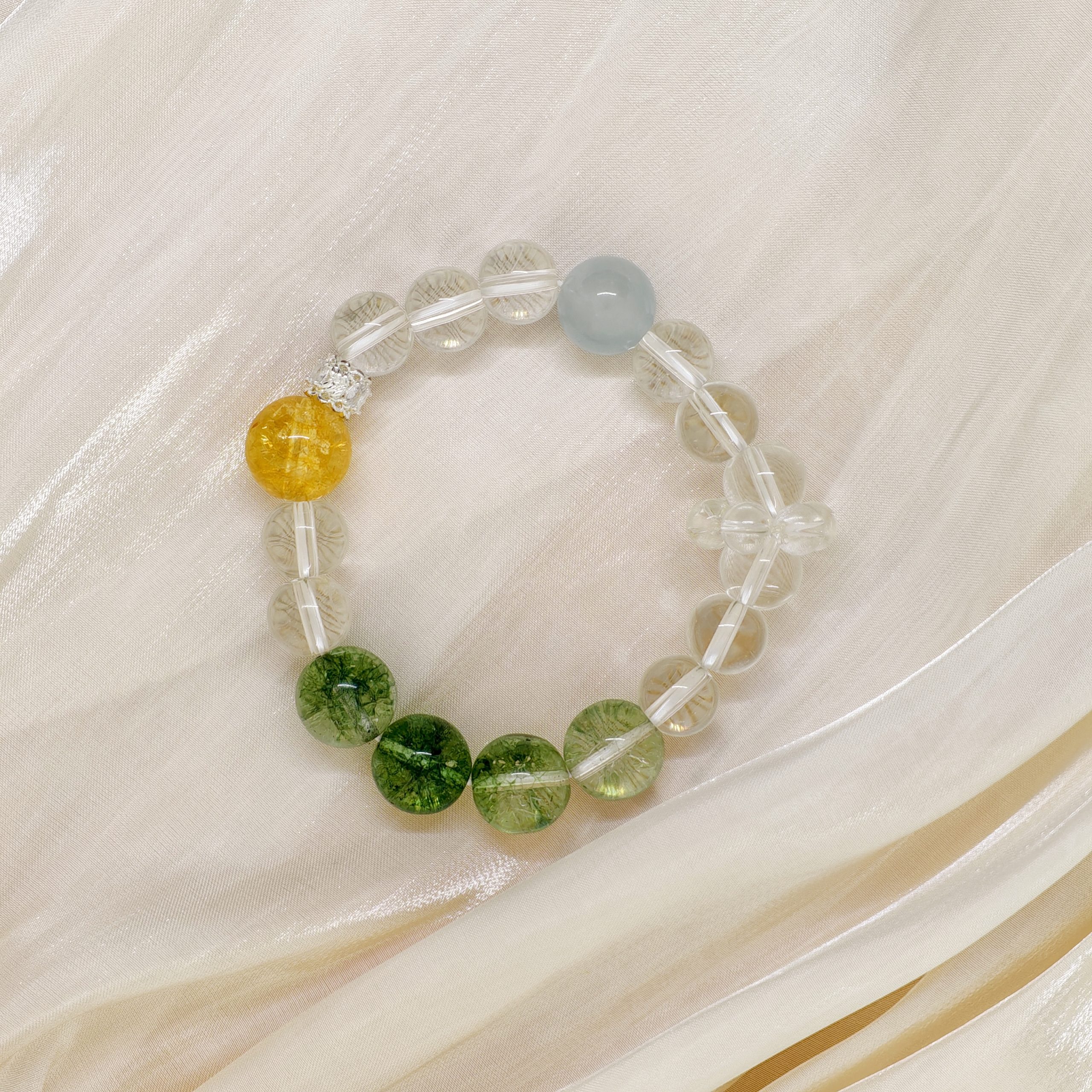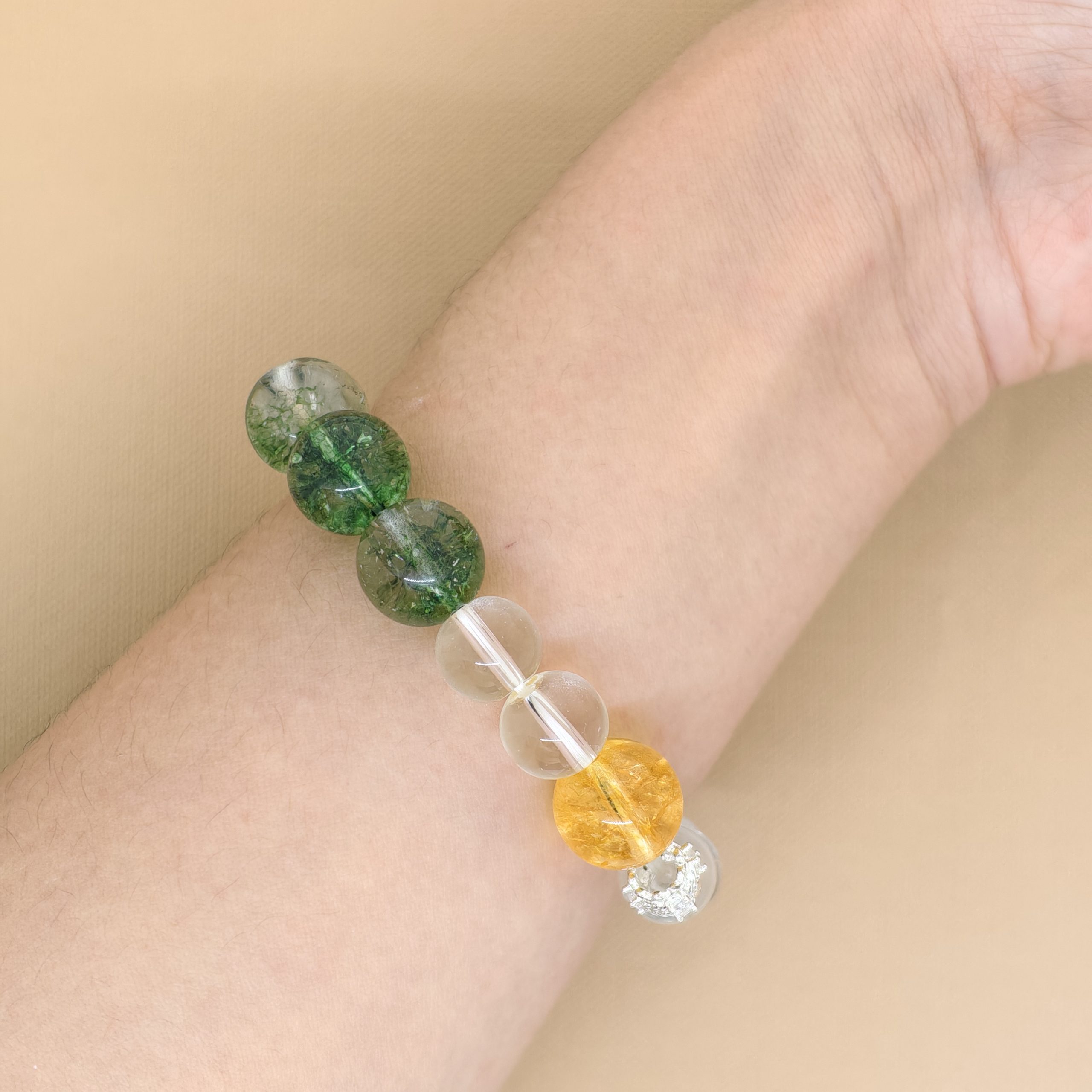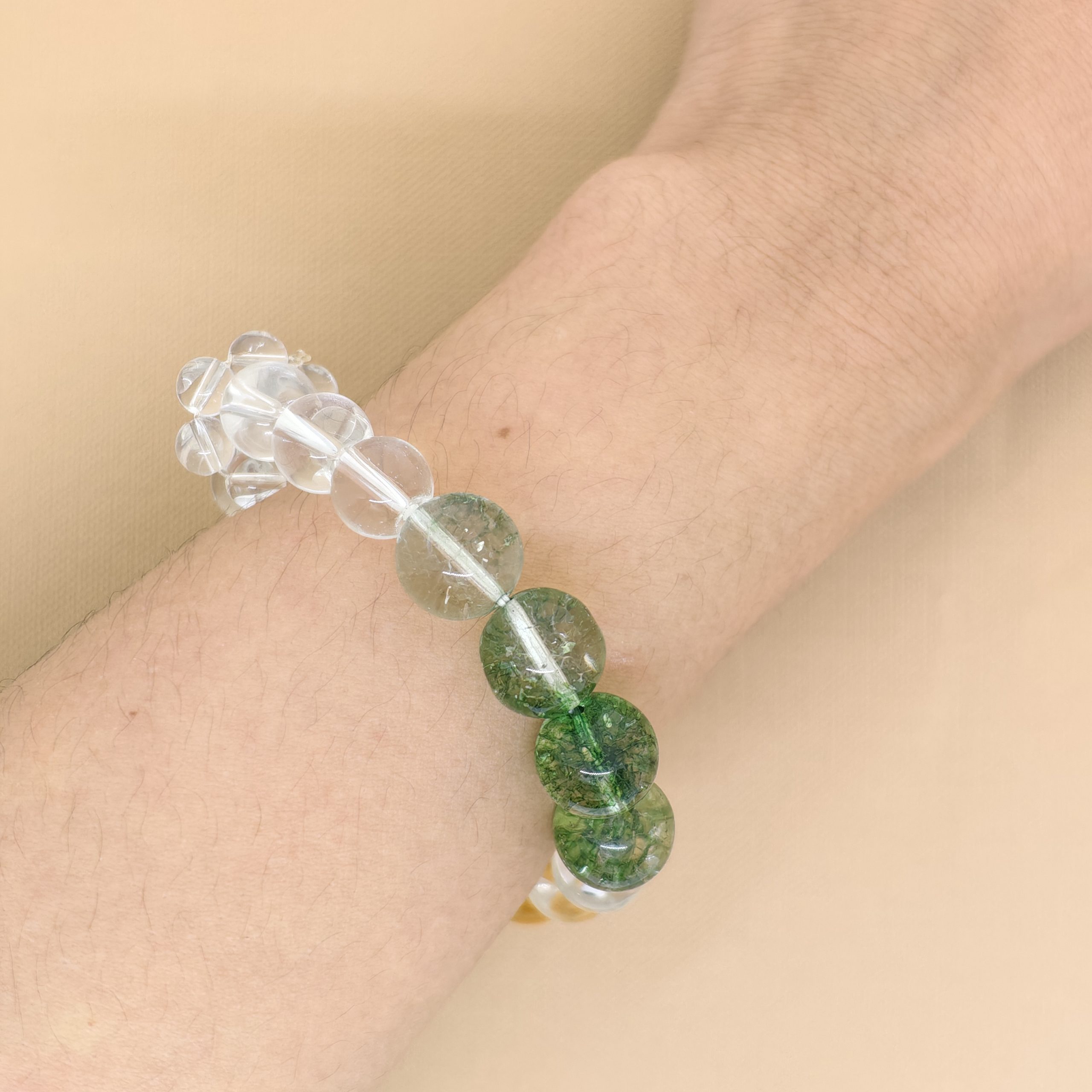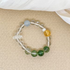Clear Quartz contains Five Elements’ energy, providing a comprehensive, harmonious frequency foundation. Green Phantom symbolizes the Wood element, representing continuous vitality, growth, and expansion. This bracelet balances all elements and injects powerful life force, enabling the deepening of your spiritual awareness and forging an unbreakable bond between mind, body, and spirit.