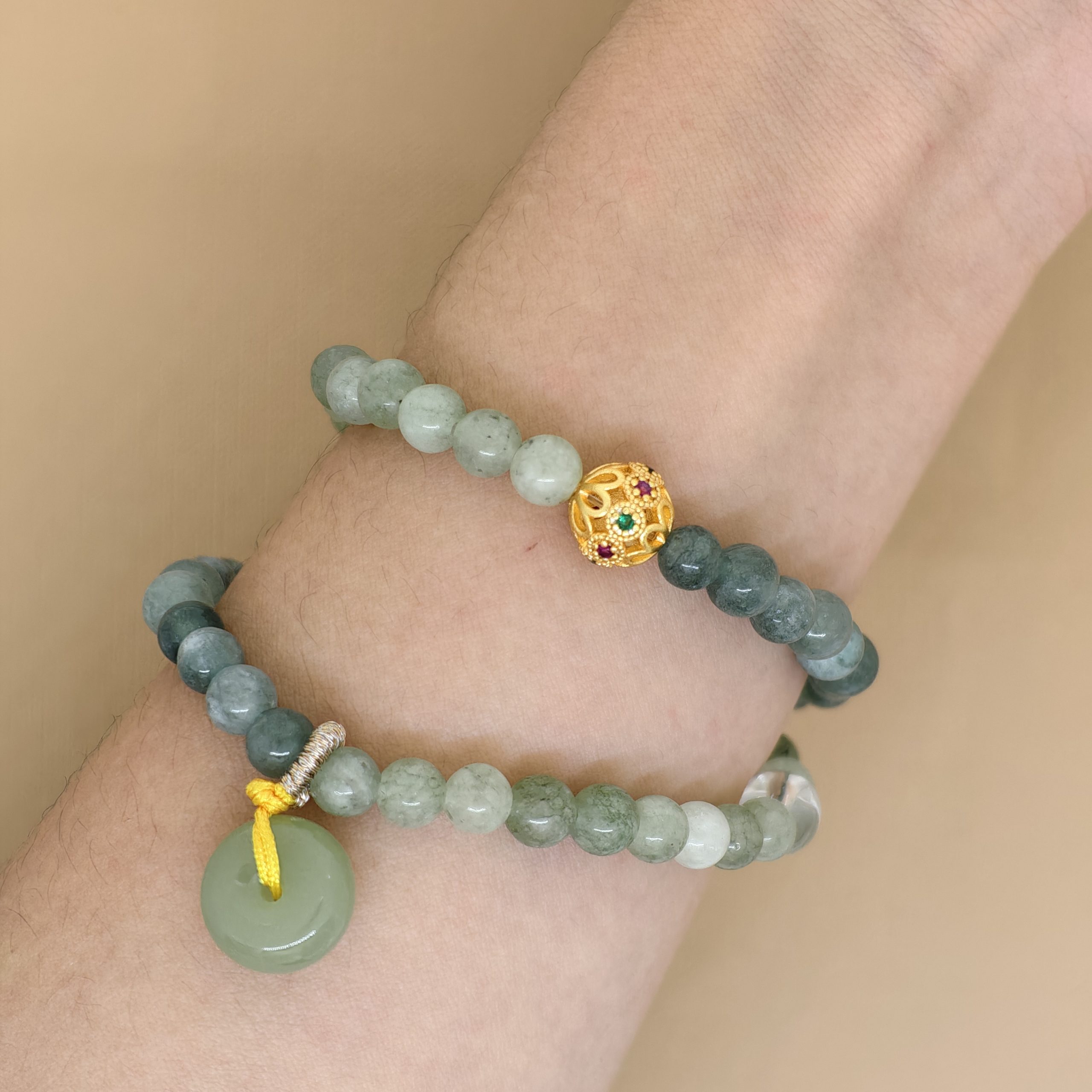 1. Green Jade and Emerald Jadeite are both pure Wood elements, symbolizing continuous growth, health, and prosperity. Paired with a Green Peace Buckle (Ping An Kou), it signifies protection and inner peace. This piece nurtures resilient vitality that thrives in adversity, pulses with lively energy that dances through life, and channels boundless life rhythm, in sync with the universe’s pulse.