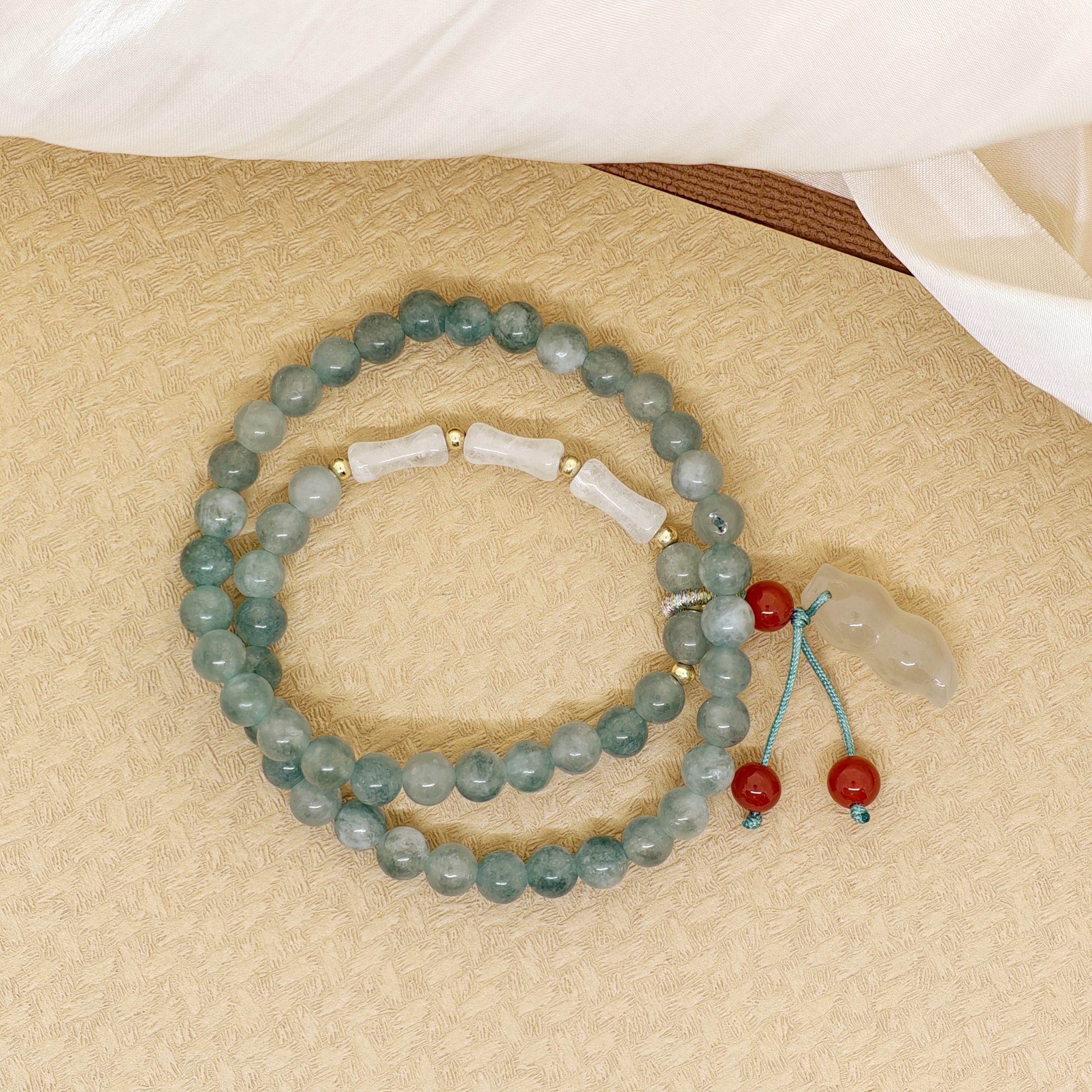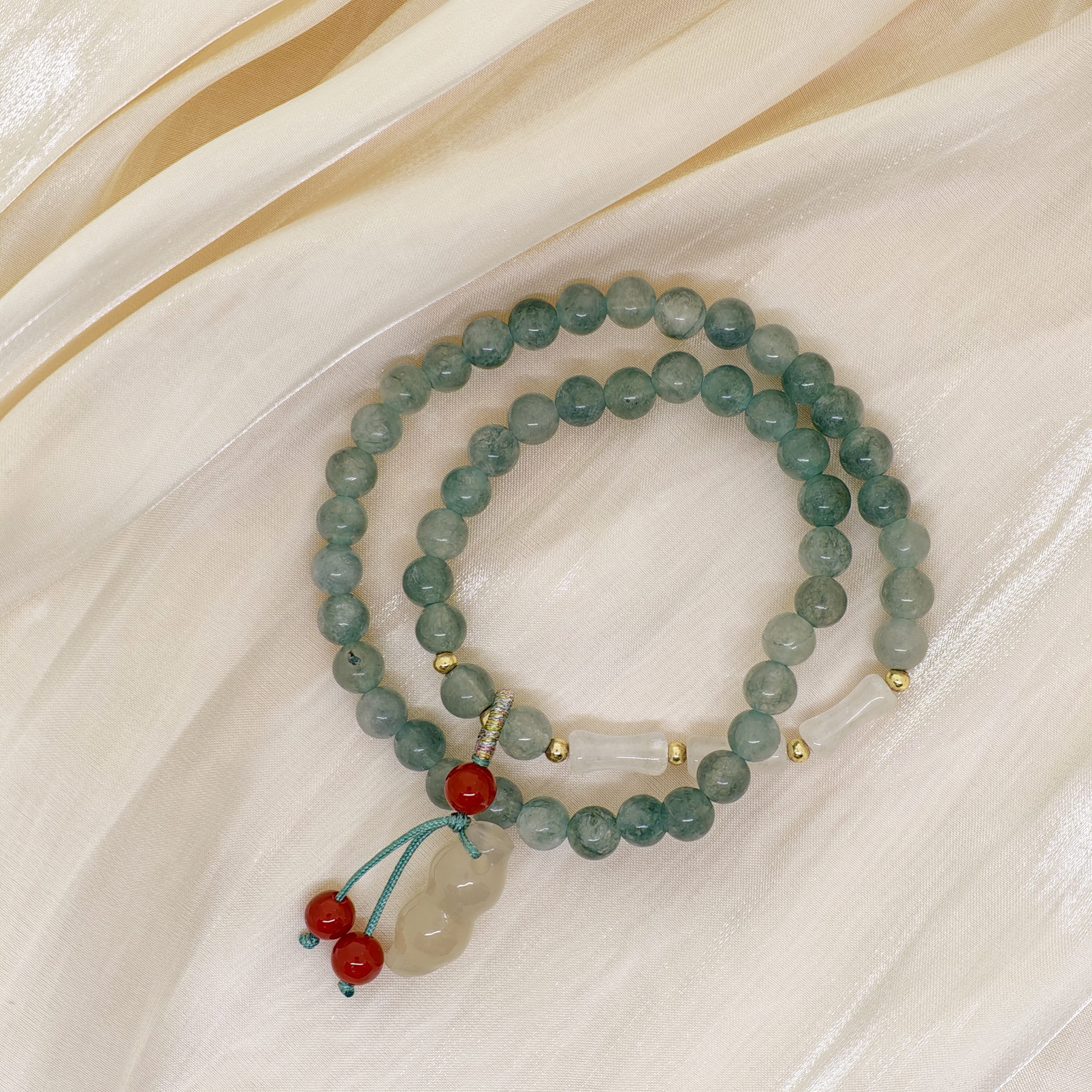 Green Jade、Green Jade、Red Agate, complemented by Electroplated Metal.